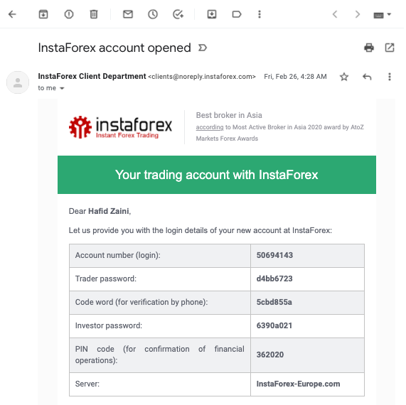 Selah melakukan pembukaan akun instaforex, klien akan dikirim sms dan email detail akun untuk login di client cabinet dan trading platform.